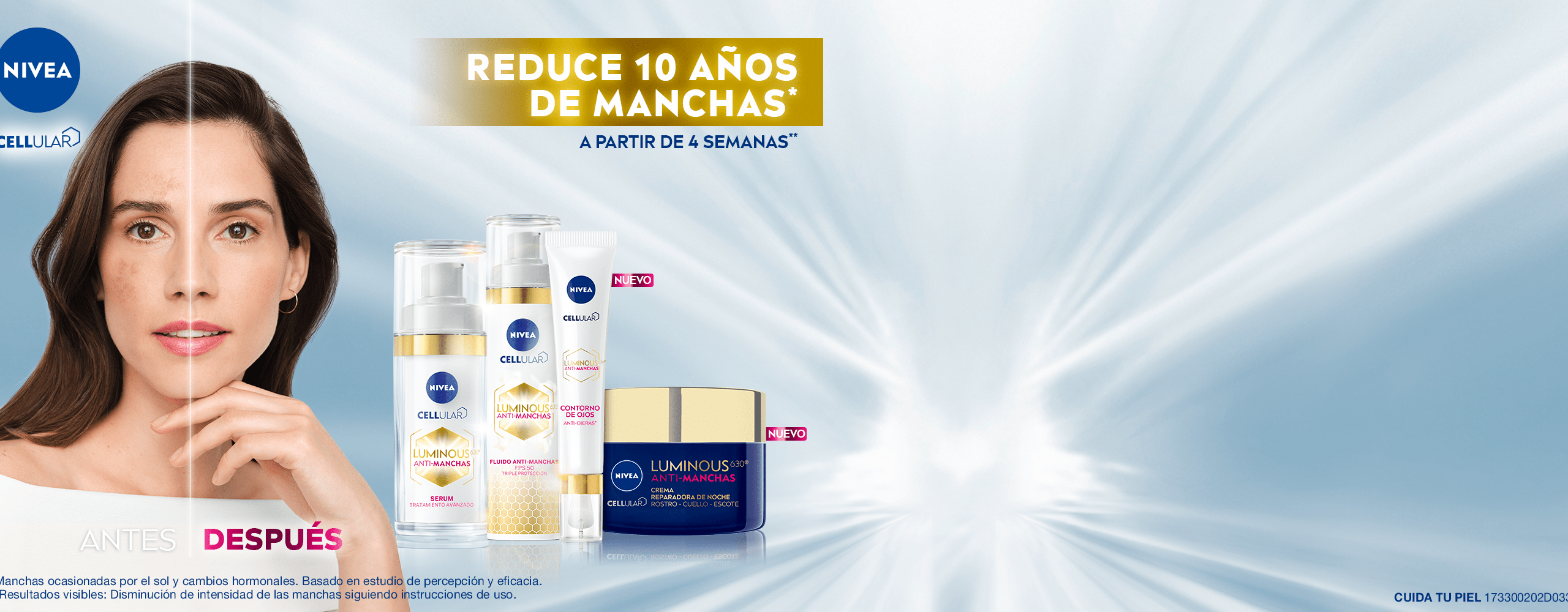 NIVEA CELLULAR LUMINOUS630 ANTI-MANCHAS, su innovadora fórmula está diseñada para tratar hasta 10 años de manchas acumuladas en tu piel y prevenir su reaparición de forma eficaz y segura, logrando resultados a partir de 4 semanas.