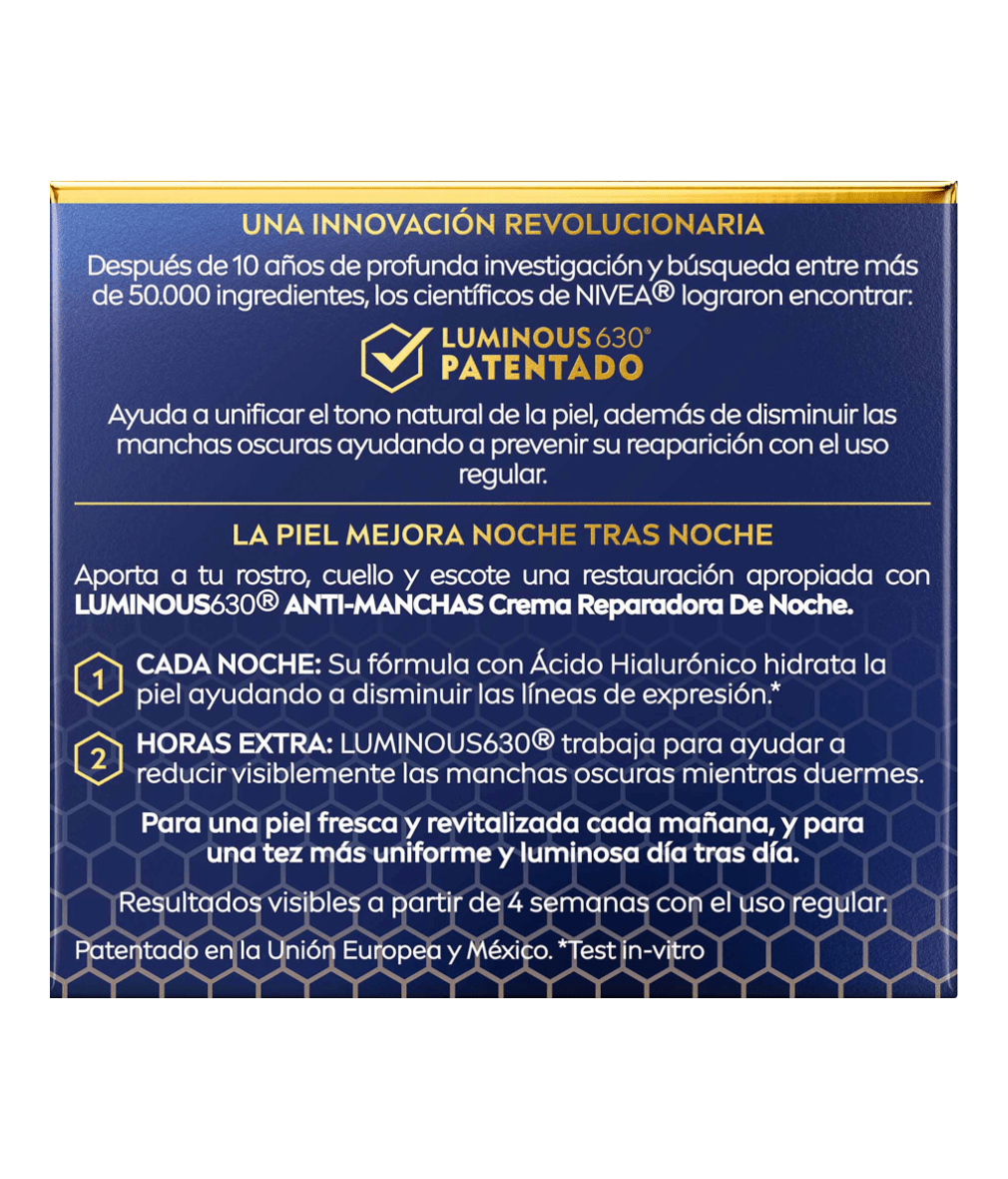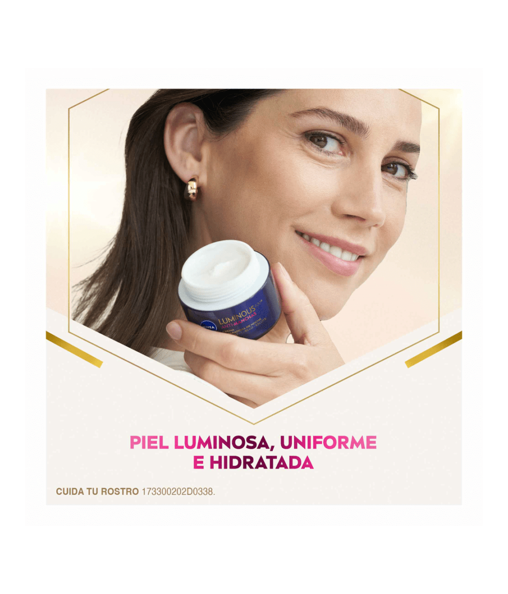- LUMINOUS630 el revolucionario ingrediente patentado por NIVEA, reduce visiblemente las manchas oscuras.