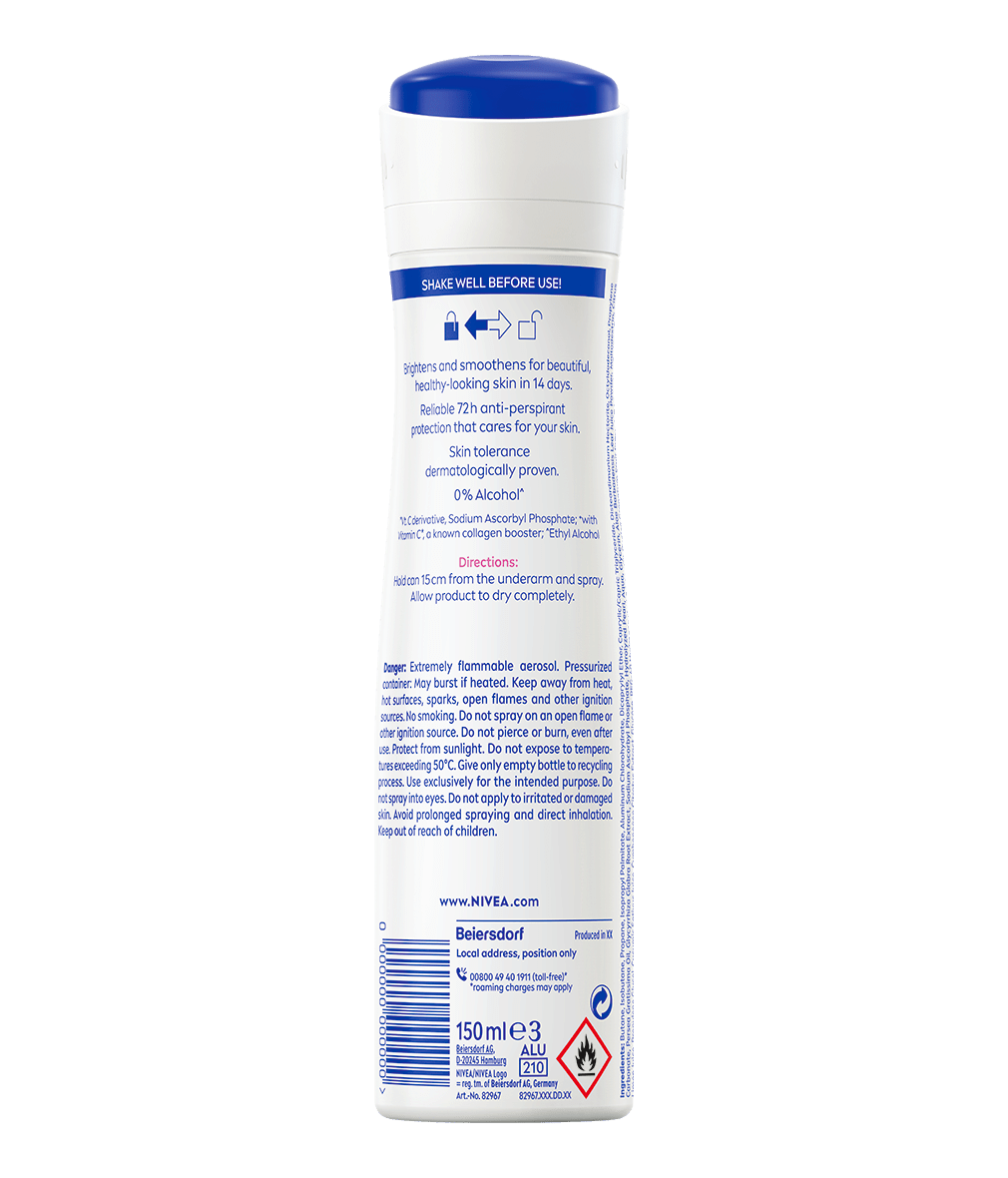 Incluído: Butane, Isobutane, Propane, Cyclomethicone, Aluminum Chlorohydrate, Isopropyl Palmitate, Glycyrrhiza Glabra Root Extract, Hydrolyzed Pearl, Sodium Ascorbyl Phosphate, Persea Gratissima Oil, Octyldodecanol, Tocopheryl Acetate, Disteardimonium Hectorite, Dimethicone, Propylene Carbonate, Dimethiconol, Parfum
