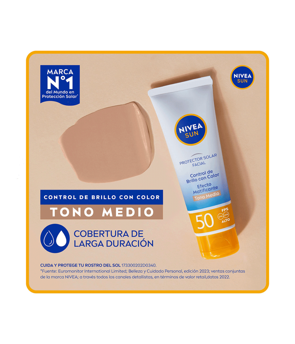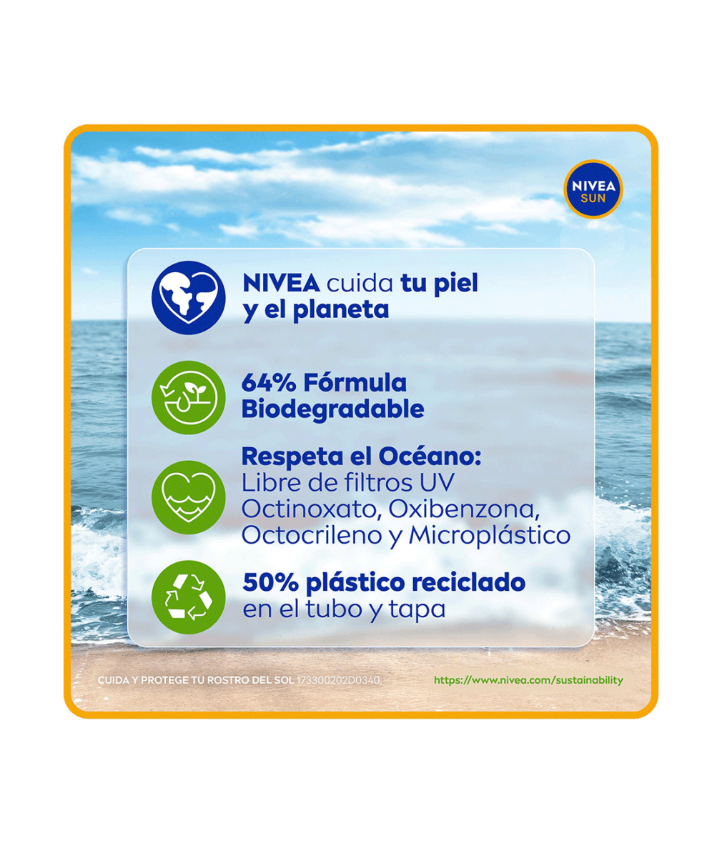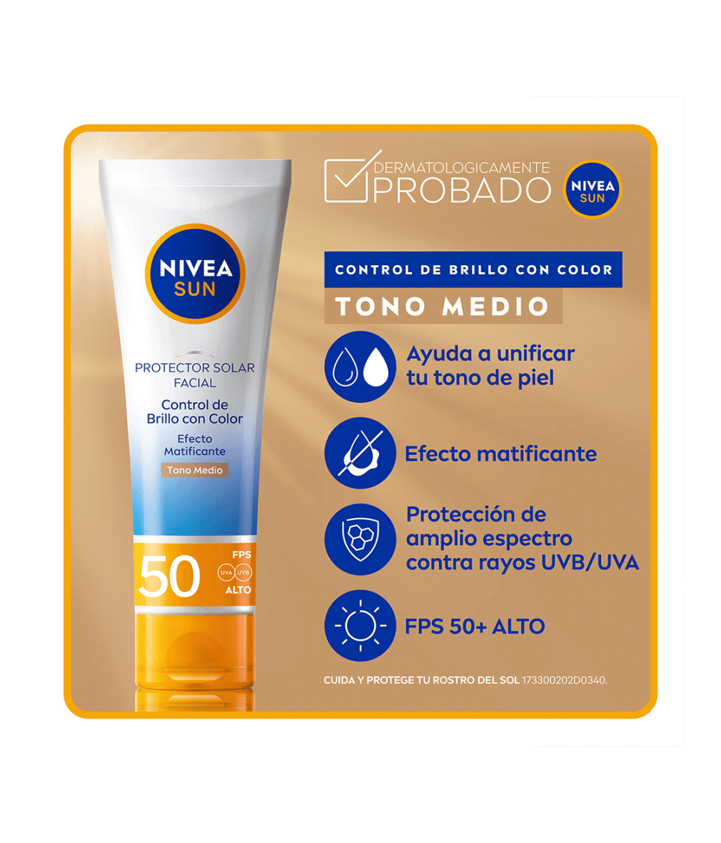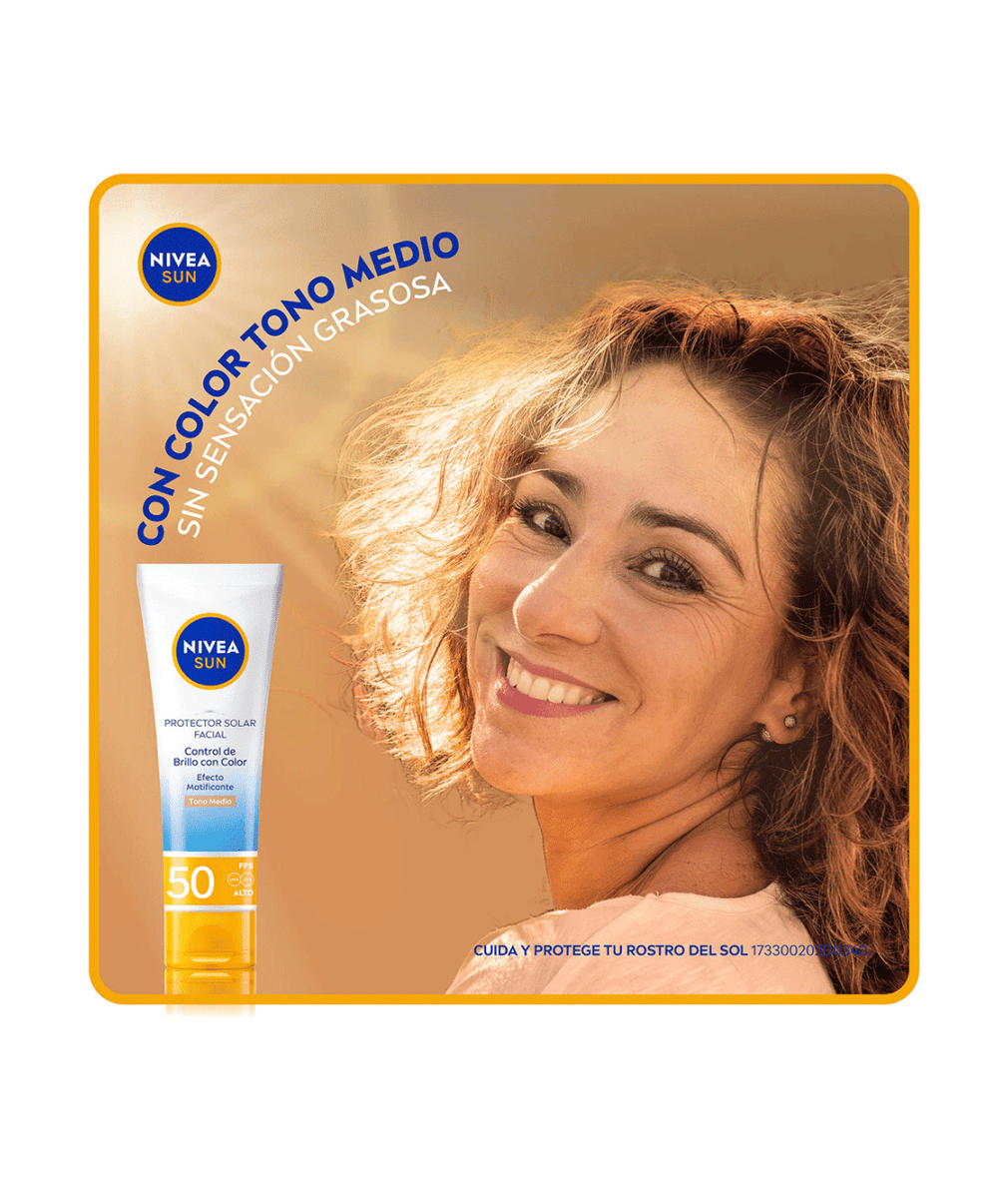 Protección inmediata para el rostro contra los rayos UVA/UVB con pigmentos con color para un tono de piel uniforme y un efecto matificante con 0% sensación pegajosa. Fórmula Ocean Respect. NIVEA SUN UV Rostro Control Brillos Crema con Color Medio FPS 50