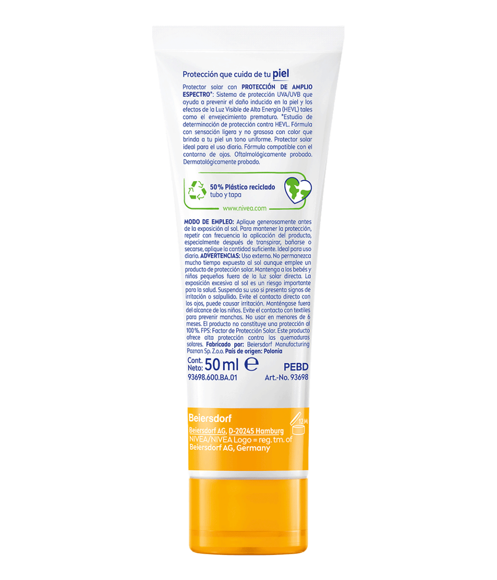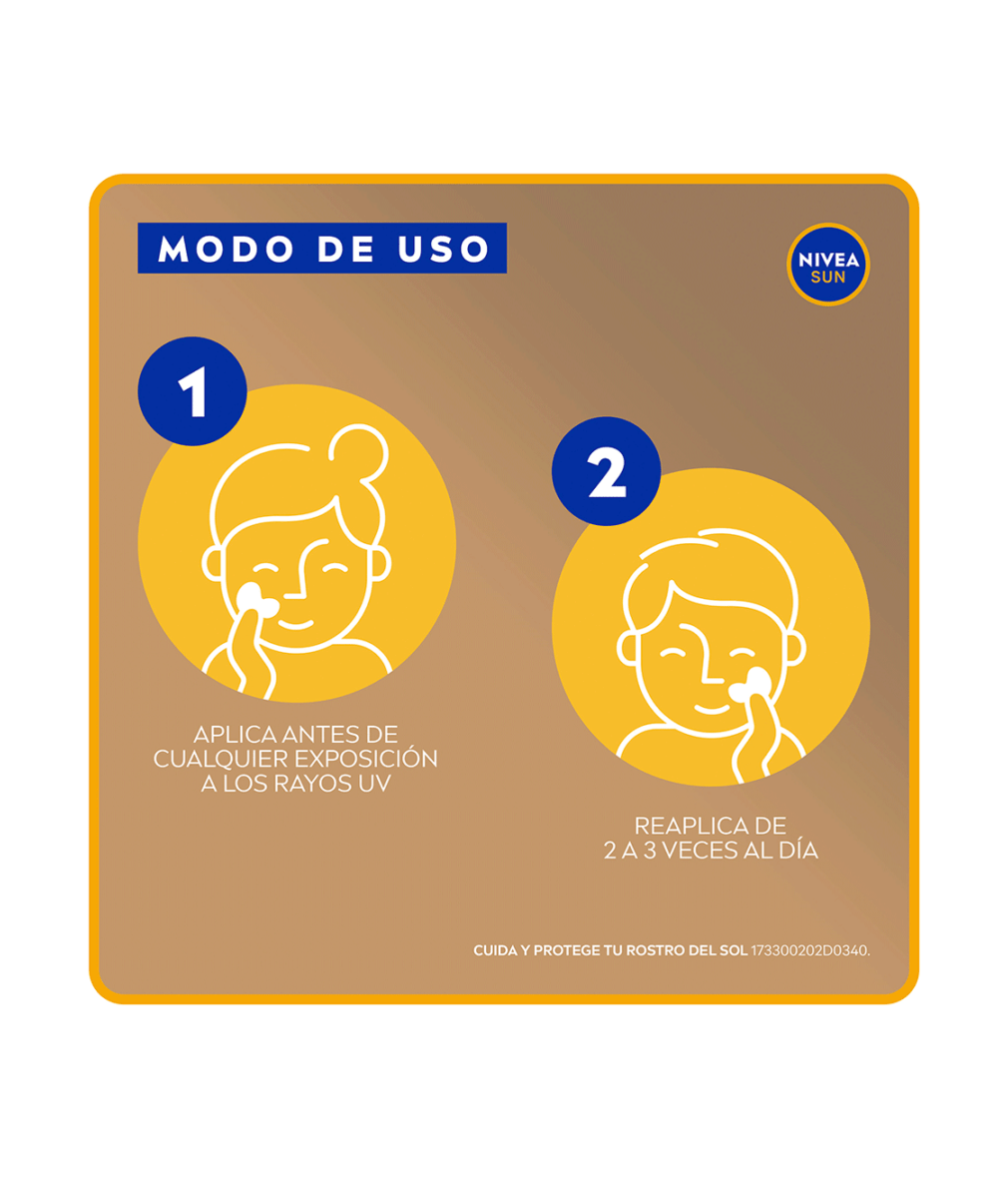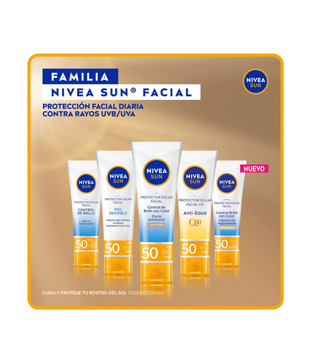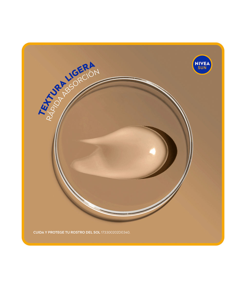 Protección inmediata para el rostro contra los rayos UVA/UVB con pigmentos con color para un tono de piel uniforme y un efecto matificante con 0% sensación pegajosa. Fórmula Ocean Respect. NIVEA SUN UV Rostro Control Brillos Crema con Color Medio FPS 50